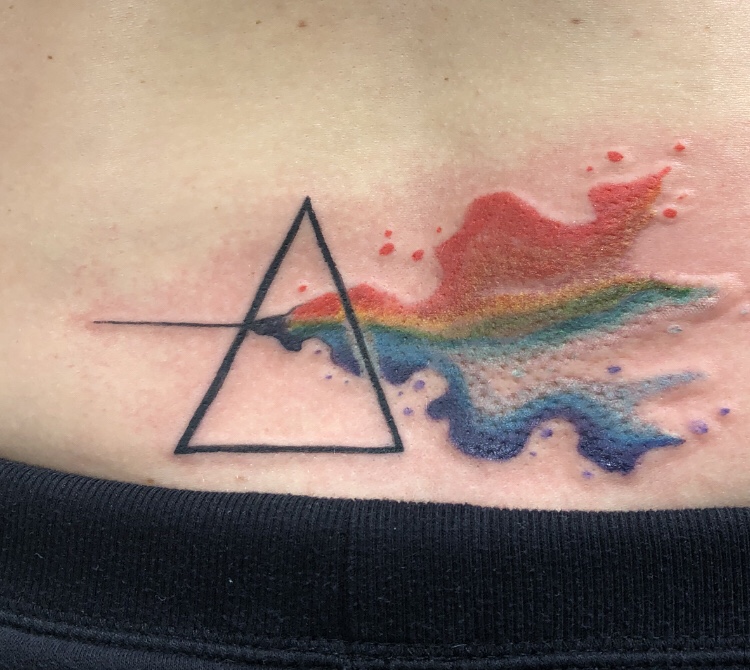- My second tattoo. It’s starting to heal nicely. My second tattoo was totally different from the first. This one was more painful. It’s also different not being able to see it. Looking in the mirror, it looks as if brilliant light is going into the prism and darkness is coming out. I would say that I like both tattoos equally though.