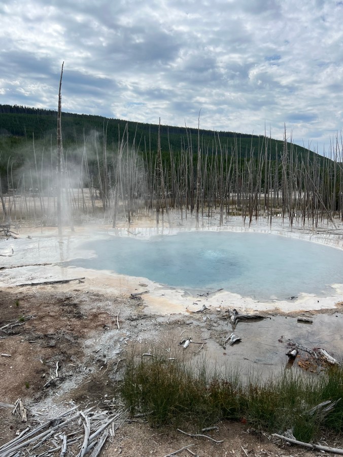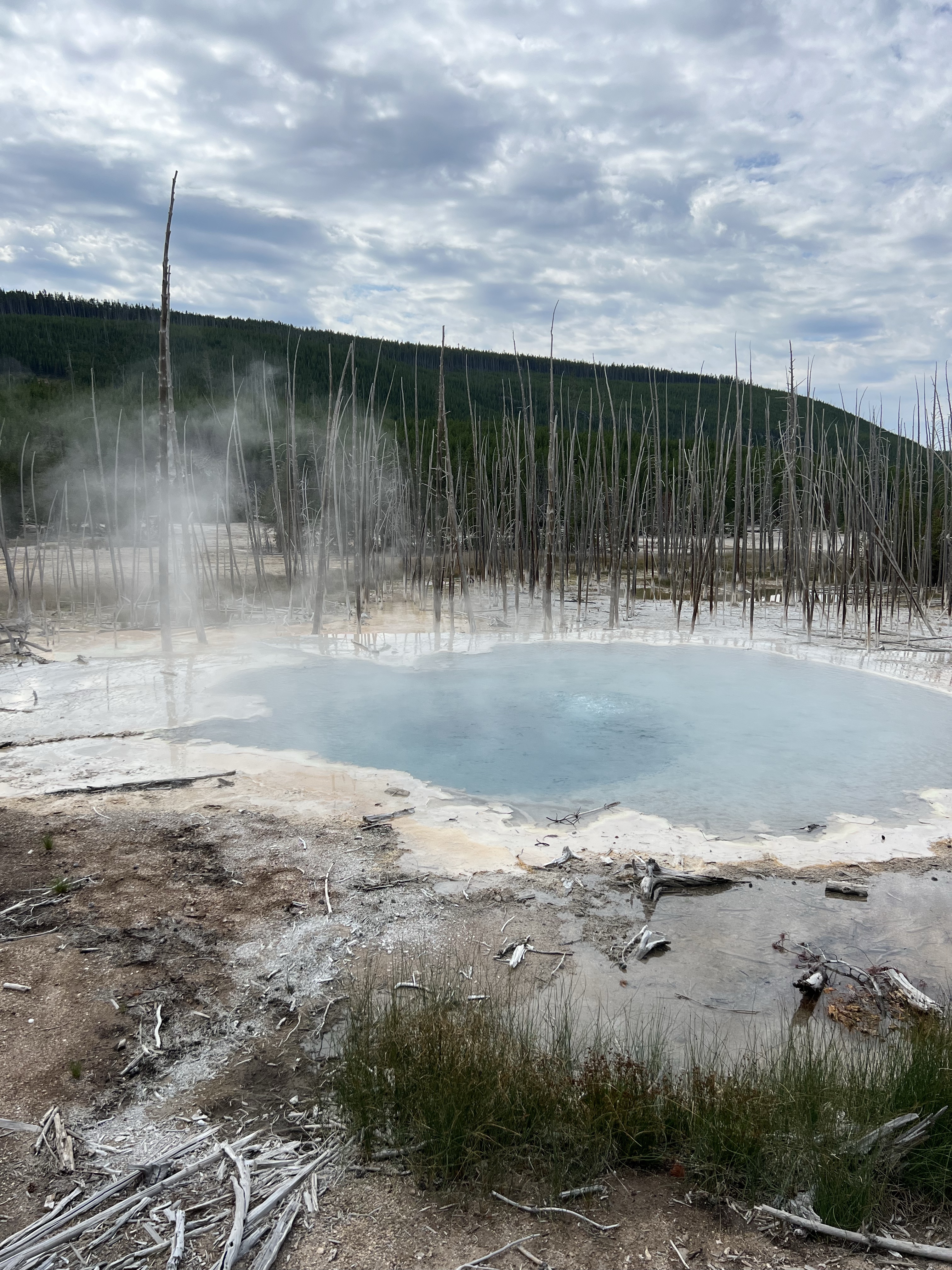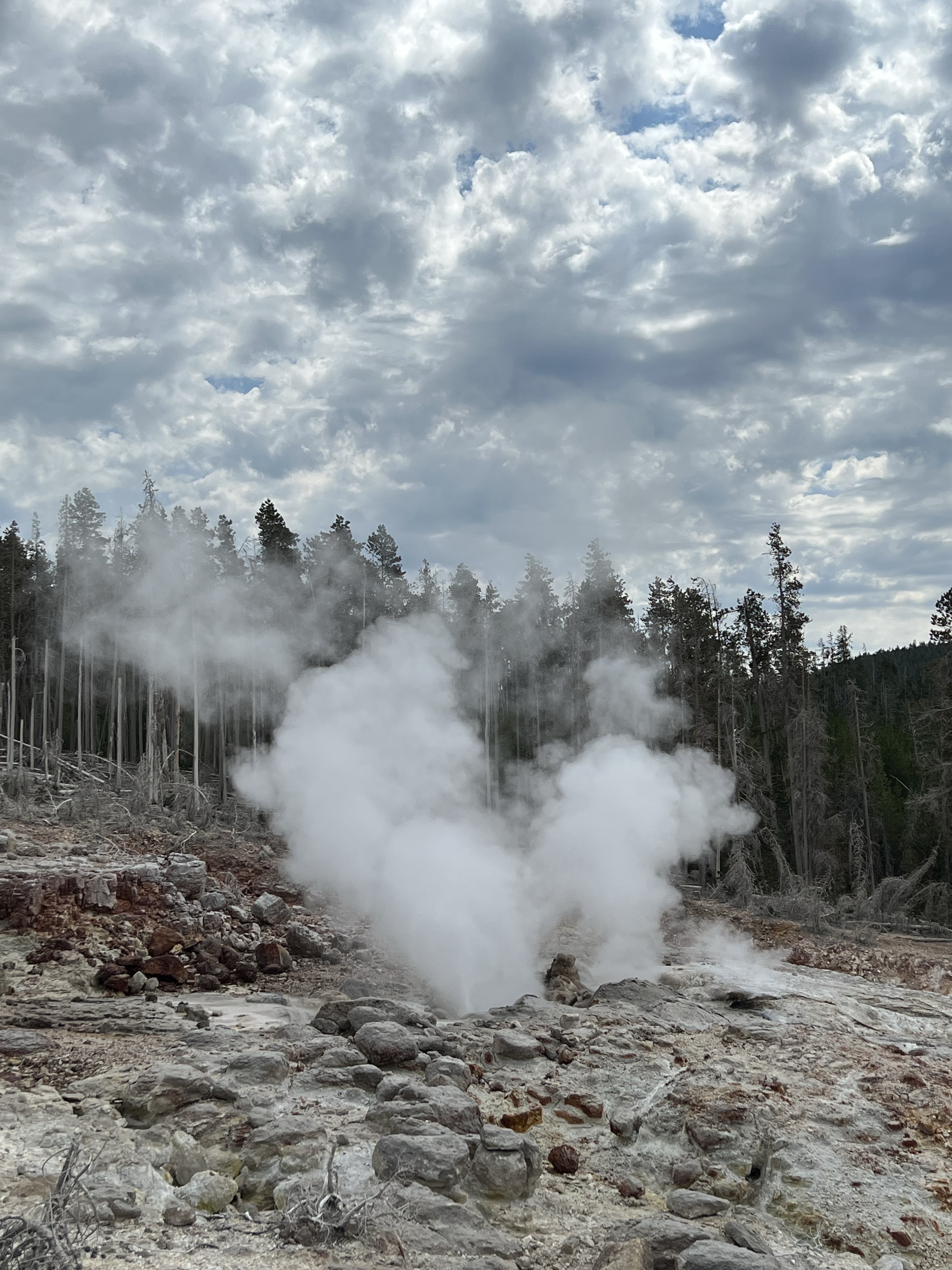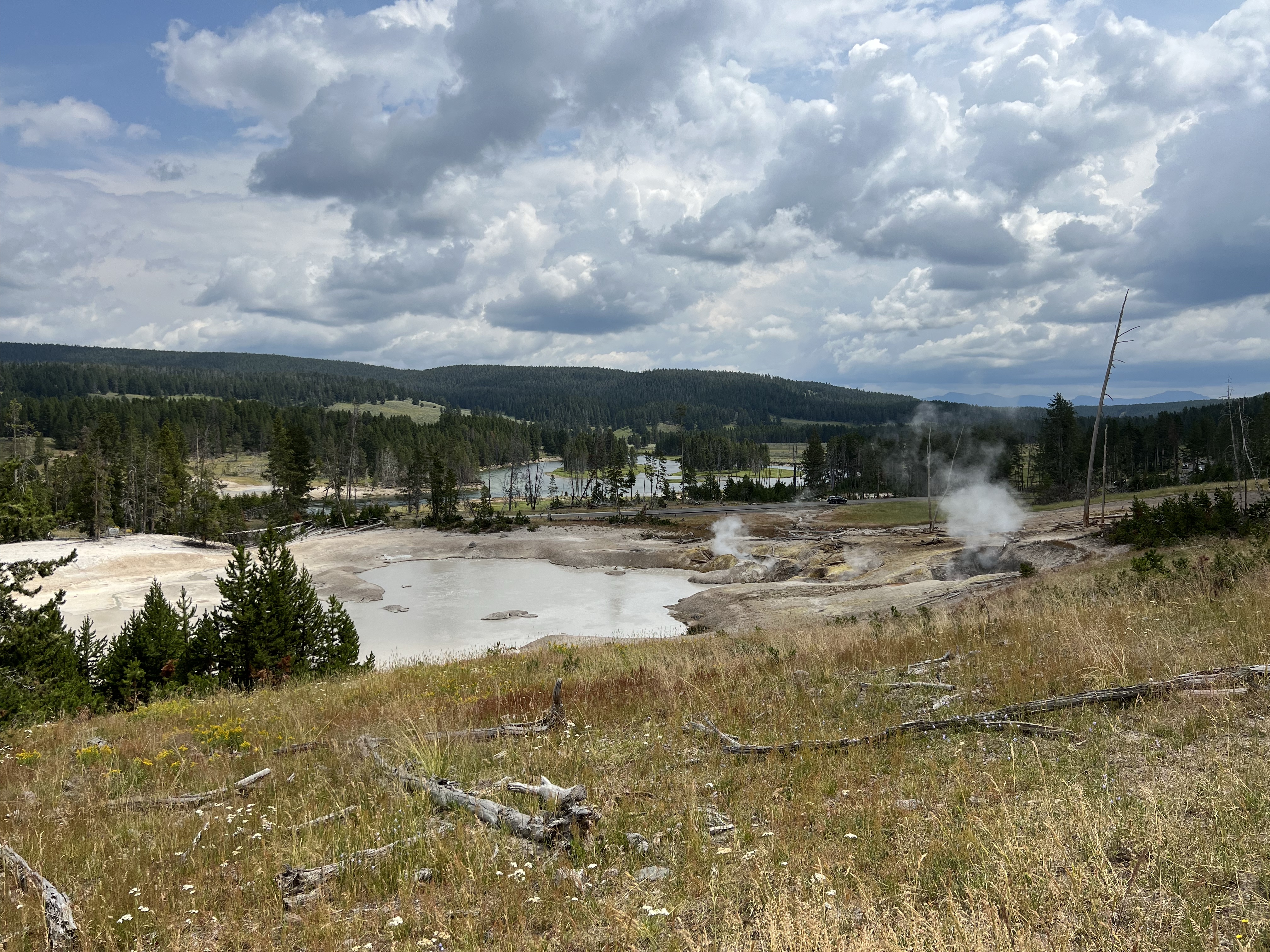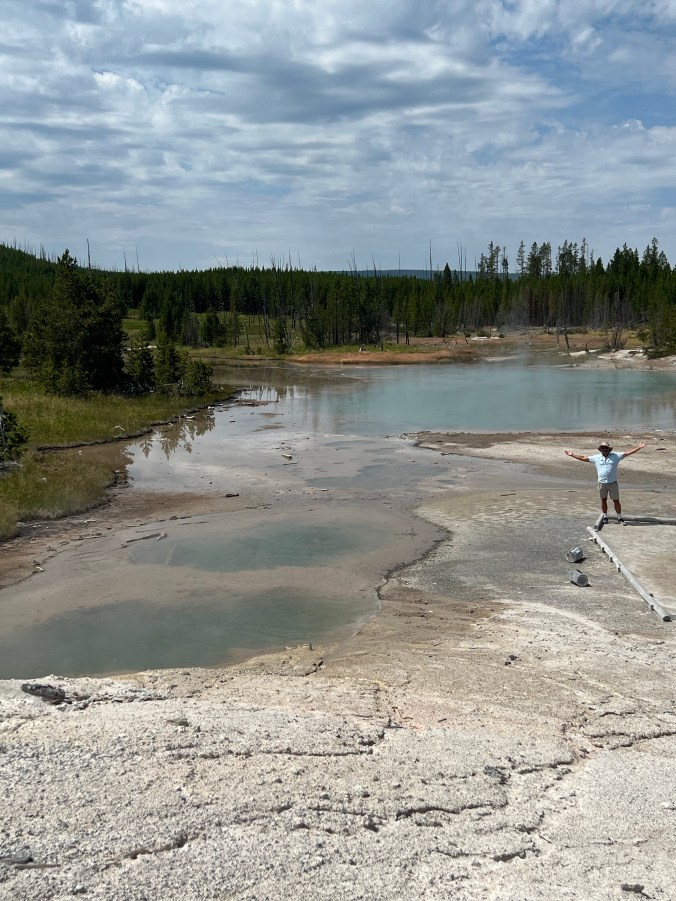 There were some challenges with the north loop we weren’t expecting. We decided to stop in Mammoth Hot Springs for lunch. It would’ve worked great, but the restaurant was closed there due to the earlier flooding. The only thing that was open was a general store were everyone went to buy food. They had a couple picnic tables set up outside which we ended up sharing with a random family. A lot of people were just sitting on the ground eating. Eating in the park was a big problem. But there were plenty of stores, gas stations, and restrooms. They even had an automotive garage on site for car repairs.