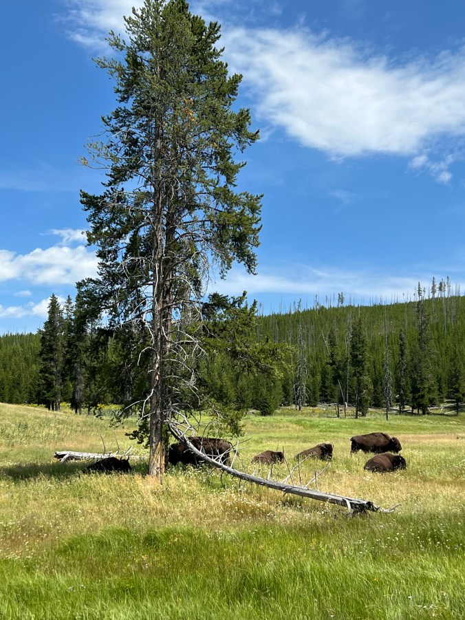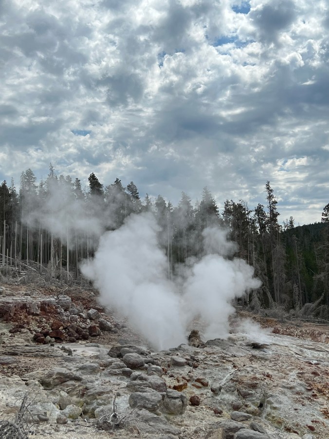 The second day we visited the south loop which we were told takes two and a half hours to drive without stopping. We had no idea how long it was going to take to get to Old Faithful. We did stop at several places along the way. One of the places we stopped had bison along the trail. There were signs to stay 25 feet away. At this particular location, there was a park ranger answering questions. After that stop, I decided being a park ranger was not as much fun as it was cracked up to be. When I first saw her, she was picking up garbage. Not long after that, someone came up to her and told her people went off the walkway. She found the people and told them to go back to their cars that they were in extreme and grave danger. I didn’t know if they went close to the geysers or approached the bison.
