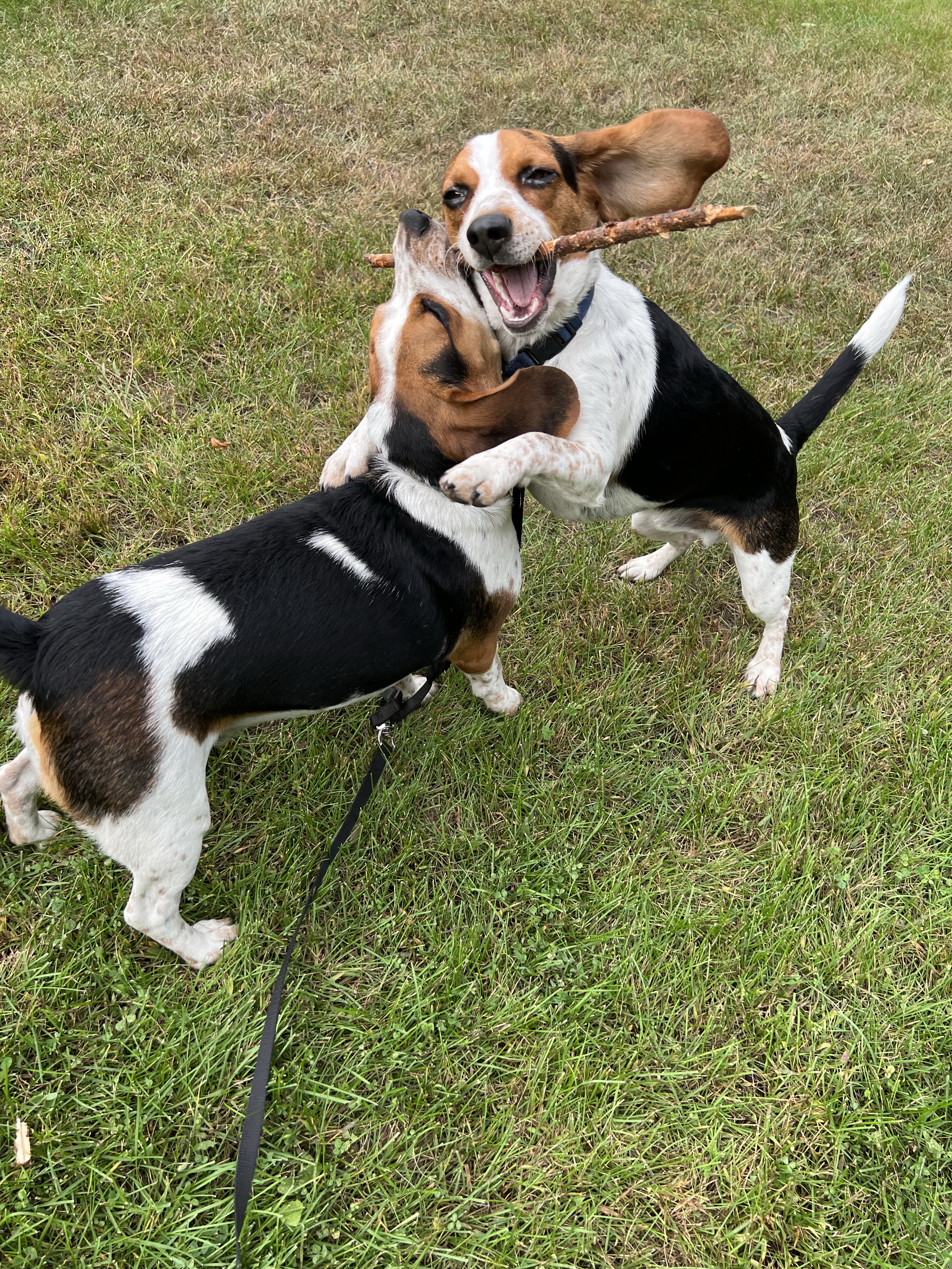 Here is a really cute picture of our Beagle puppies. They love playing together in the yard with toys, sticks, or anything they can find.